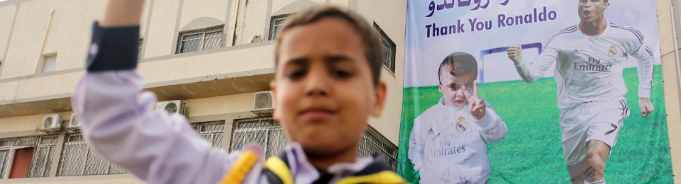 Poster of Real Madrid footballer Cristiano Ronaldo and Palestinian Ahmed Dawabsha, 5, who met in Spain in 2016 one year after Dawabsha survived an arson attack on his West Bank home in Duma, in which both of his parents and infant brother were killed by Israeli extremists. Yarmouk Stadium, Gaza City, March 27, 2016. (Photo: Ashraf Amra)